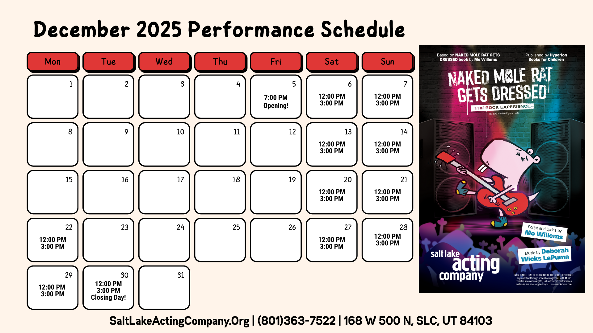 Opening Night will be Friday, December 5th at 7 PM. Following opening, the production will run through December 30th on Saturday and Sunday afternoons at 12 PM and 3 PM, with added performances on Monday, December 22nd, Monday, December 29th, and Tuesday, December 30th, all at 12 PM and 3 PM.